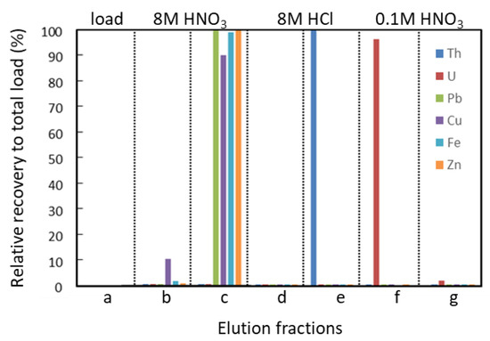 AG1-X8 is a common anion exchange resin used in the analysis of geological samples. As shown in Figure 2, the separation of Th and U was investigated using 0.4 mL of AG1-X8 resin for the standard solution SS-1 (see Section 2.1). Fe, Cu, Zn and Pb were completely eluted by less than 3.0 mL of 8 M HNO3. Recoveries of Th and U (measured vs. loaded) were greater than 95%. Therefore, we considered another separation step in the reports [7,9,12] to separate omittable Pb.