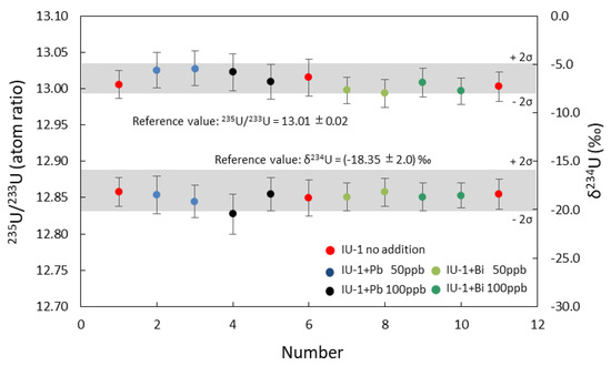 Effects of Pb and Bi on 235U/233U and δ234U of IU-1.