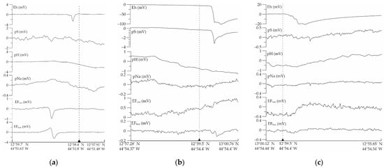 The results of profiling by EF (horizontal and vertical components), Eh, pH, pNa and pS sensors: (a) over the Ashadze-1 field at 30–40 m above the bottom; (b,c) over the Ashadze-2 field at 110–150 m above the bottom. The dotted line shows the position of the hydrothermal source.
