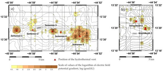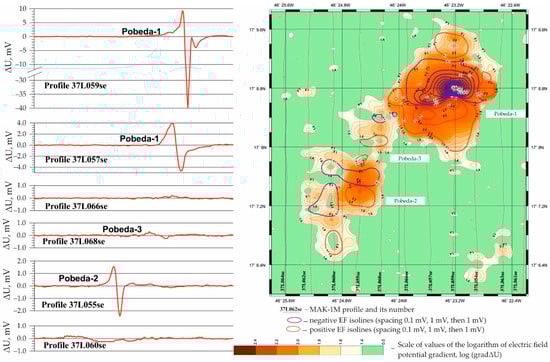 (Left) the EF anomalies near the Pobeda hydrothermal cluster; (right) combined scheme of isolines of the EF (ΔU) and the logarithm of the gradient ΔU, Pobeda hydrothermal cluster (modified after Gablina et al. [34]).