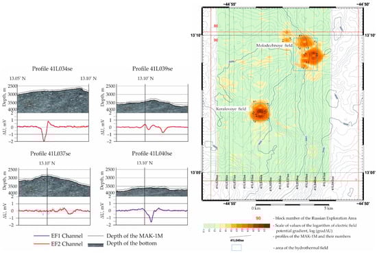 (Left) the EF anomalies on profiles; (right) scheme of the logarithm of the gradient ΔU. The Molodezhnoye and Koralovoye HF’s.