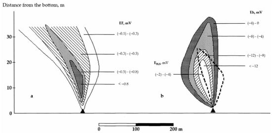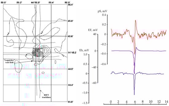 (Left) anomalies of the Eh at 15 m from the ocean floor [38]; (right) from bottom to top: anomalies of the Eh, EF and content of sulfide sulfur (pS) in the ascending (15 m above the bottom) hydrothermal plume of the Logachev field [40].