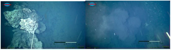 The main signs of active hydrothermal discharge are hydrothermal buildings, their debris, and the “smoke” of smokers (Figure 8). TV observations do not detect areas of low-temperature activity since they do not form significant hydrothermal structures and do not produce the “smoke.”