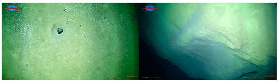 Near the Koralovoye HF, we noted a lithification in the flank of the fault below the slope and around a ′′hole′′ in the sediments (possibly, a low-temperature vent). Lithification is possibly caused by the transit of hydrothermal fluid through them (Figure 9). Fluid penetrates into the sediments and cools down because of mixing with seawater under subsurface conditions. In the process of fluid interaction with rocks, the cementation of sediments occurs due to the redeposition of carbonate material and the deposition of metal sulfides. Lithified sediments can be considered a sign of low-temperature discharging.