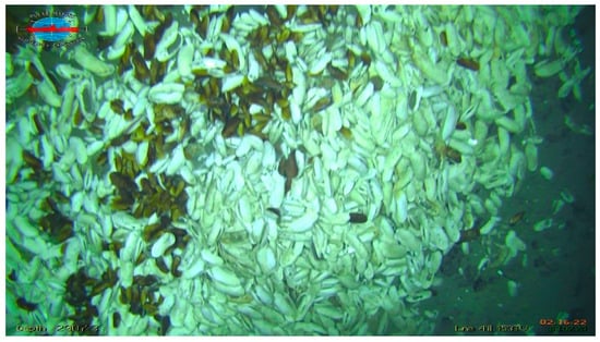 Additionally, an indirect sign of low-temperature hydrothermal activity may be endemic organisms near hydrothermal vents [46], in particular, mollusks Caliptogena sp. (Figure 10). Bivalves Caliptogena sp. exist in symbiosis with chemoautotrophic thiobacteria and for their existence, numerous elements and compounds (Cu and Zn sulfides, hydrogen, methane, etc.) are needed. Mass accumulation of these organisms may indicate hydrothermal activity, including low–temperature [47].