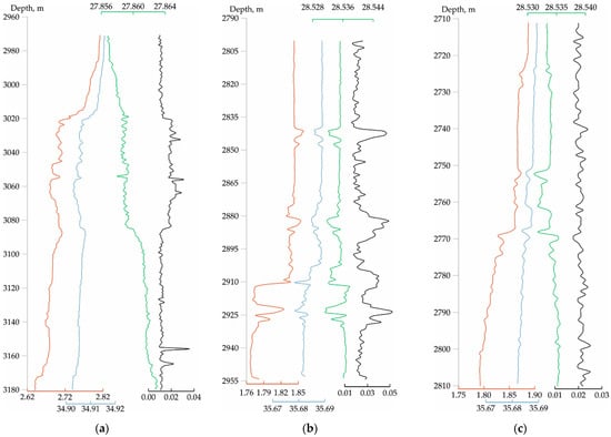 Changes in geophysical parameters near the Logachev (a), Ashadze-2 (b) and Koralovoye (c) HF’s: temperature (red, °C), salinity (blue, ‰), density (green, kg/m3), turbidity (black, FTU).