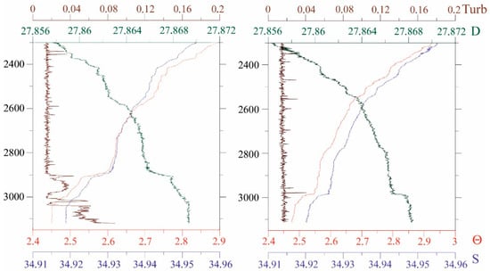 Over a long period, we have obtained graphs of the distribution of geophysical parameters near numerous HF’s (Figure 11). The vertical distribution of parameters near the bottom at all stations is typical of near-bottom tropical Atlantic water. It is characterized by a close-to-linear trend of a decrease in salinity and temperature and an increase in density with microinversions. Background turbidity values near the bottom, on average, reach values of 0.012–0.024 FTU. Anomalies of a hydrothermal nature distorted the linearity.