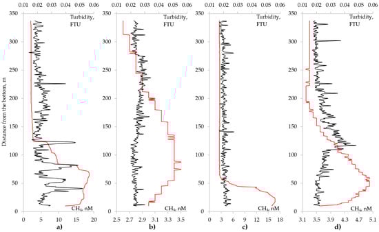 Change in the concentration of dissolved methane (red) and turbidity (black) with depth: (a) 50 m to the NW from the Irina-I vent (Logachev field); (b) 160 m to the NW from the Molodezhnoye field; (c) 190 m to the NNE from the Koralovoye field; (d) 200 m to the SE from the Koralovoye field.