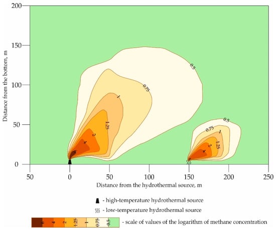 Based on the results of the sampling of the Logachev hydrothermal fluid end-member [29] and hydrothermal plumes, a schematic structure of methane anomalies was constructed (Figure 14). The maximum concentrations of CH4 in our work are close to the ocean floor (~50–100 m), below the levels of turbidity anomalies. In the case of low-temperature discharging, methane anomalies are present without any signs of increased turbidity, and the maximum is located at ~ 20–30 m from the bottom.