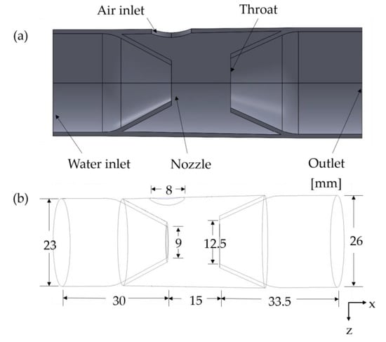 The micro–nanobubble generator used was based on a laboratory cyclonic jet flotation cell, as shown in Figure 1a. The nozzle was at the center of the suction pipe. The diameter of the nozzle outlet was 9 mm, the throat diameter was 12.5 mm, the distance between the mouth and throat was 15 mm, and the diameter of the air inlet was 8 mm, as shown in Figure 1b.