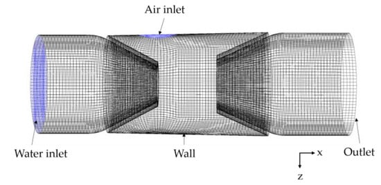 The three-dimensional model of the generator is imported to the Integrated Computer Engineering and Manufacturing (ICEM). We repaired the model through geometry in the ribbon, then generated the boundary interface, created a block through the blocking option in the ribbon, and captured the projected points to achieve appropriate correlation results. Then, we segmented the Blocking, and finally we completed the mesh generation in the Mash option. To ensure the quality of the simulation solution, the bubble generator was divided into a structured grid, and the nozzle and throat were encrypted, as shown in Figure 2, which shows a computational mesh with 409,462 mesh cells. We checked the mesh quality in the Edit Mash option and obtained a mean quality of 0.8267, which is very close to 1, meaning that the mesh quality was good.