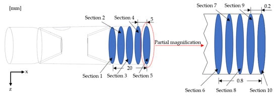For convenience of observation, the transverse inlet direction was assumed to be the positive direction of the x-axis. We took 20 mm from the Outlet as Section 1, and then took a section every 5 mm to obtain Sections 1, 2, 3, 4, and 5. Then, we took 0.8 mm from the Outlet as Section 6 and took a section every 0.2 mm to obtain Sections 6, 7, 8, 9, and 10. As shown in Figure 3.