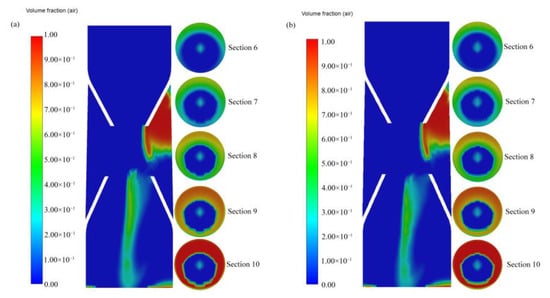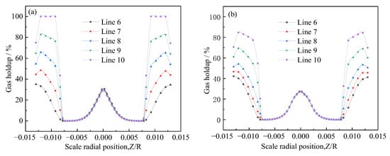 Five sections were selected at the lateral center of Sections 6–10, which were Line 6, Line 7, Line 8, Line 9, and Line 10. Figure 5a,b show that the gas accumulated more at both ends and was lower near the wall. A certain amount of gas was also observed in the center due to the jet. When the inlet flow rate was 6.5 m/s, the gas content near the wall was higher than when the inlet flow rate was 7.5 m/s. Moreover, at an inlet flow rate of 7.5 m/s, the gas content at the center of the pipe was higher than that at an inlet flow rate of 6.5 m/s. This was because the flow velocity at the center increased along with the inlet flow rate, which pulled in more air bubbles moving in flow in the center.