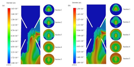 Figure 6 shows a cloud diagram of the diameter distribution of bubbles generated in the bubble generator when the inlet flow velocity was 6.5 m/s and 7.5 m/s. The cross-section cloud diagram in Figure 6 shows that the bubble diameter was constantly increasing. Figure 3 demonstrates that most of the gas was mainly distributed in the center of the tube at Sections 1–4. From the comparison of the cross-section bubble diameter cloud diagram, it can be seen that the bubbles were constantly moving towards the wall. This is consistent with Liu et al. [39], who found that the bubbles move toward the wall at the diffuser tube from the radial velocity of the bubbles when simulating the jet microbubble generator. Finally, the gas-phase distribution at the outlet exhibited the pattern shown in Figure 4. This may be because the breaking efficiency was greater than the coalescence efficiency at the beginning; hence, bubble breaking was the dominant process. The greater-diameter bubbles located in the center first broke into small ones and then moved to the periphery of the tube. Then, bubble coalescence started to dominate, and small-diameter bubbles coalesced to form large-diameter bubbles until the bubbles collapsed, merged, and equilibrated. As only one suction port was available, large-diameter bubbles on the wall near the suction port end were observed in the cloud map, and the gas tended to move towards this region. This was consistent with Liu et al. [39], who found that there was eccentricity in the movement of bubbles in a jet microbubble generator with a single-pipe air intake structure.