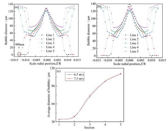 Five cross-sections at the lateral center of Sections 1–5, which were Line 1, Line 2, Line 3, Line 4, and Line 5, were taken. Figure 7a,b show that the diameter of the bubble inside the generator was approximately within the range of 0.99 μm to 140 μm, while the diameter of the bubbles at the wall and center of the tube was larger. The bubble diameter at both ends of Line 1 and Line 2 was the smallest and could reach 0.99 μm. Bubbles at the walls of Line 3, Line 4, and Line 5 gradually coalesced to form larger ones. By contrast, the bubble diameter at the center of Line 1 was larger than at the wall. From Figure 7c, it was clear that the bubble diameter increased from an average diameter of 30 μm to one of approximately 110 μm. The average diameter of the bubbles did not increase rapidly from Sections 1 to 2, while from Section 2 to Section 5, the bubble diameter increased sharply, and the growth rate was particularly prominent from Sections 2 to 4.