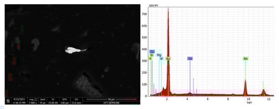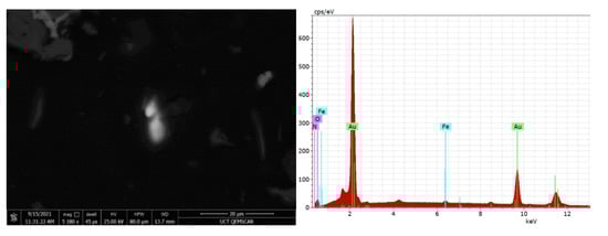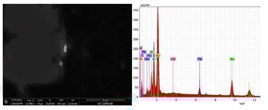 By manual search on SEM-EDS, gold was visually examined in the three ores (Figure 1, Figure 2 and Figure 3). This indicates that some of the gold particles exist in their native form as free gold and can therefore be extracted effectively by leaching and gravity separation. The gold particles in Figure 1, Figure 2 and Figure 3 had a long diameter of 4 µm, 5 µm, and >1 µm, respectively.