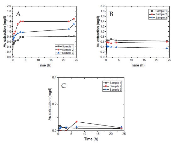 The diagnostic leach tests were conducted following the procedure presented in Table 4. In stage 2, the first cyanide leach test after panning (Figure 5A) showed a final gold extraction of 0.81 mg/L, 1.5 mg/L, and 1.3 mg/L for Sample 1, Sample 2, and Sample 3, respectively. The gold extracted at this stage is not considered refractory since it was recovered by conventional cyanidation. In stage 3, there was further extraction of gold by HCl leach (0.18 mg/L, 0.33 mg/L, and 0.12 mg/L for Sample 1, Sample 2, and Sample 3, respectively) which means that the previous cyanidation step, which was conducted at a high cyanide concentration of 20 g/L, did not recover all the gold. This indicates that this portion of the gold leached by HCl was refractory to cyanide and possibly hosted by sulphides such as pyrrhotite. The HCl leach also extracted As, especially in Sample 2, as well as Cu and Fe. In stage 4, the second cyanide leach test (Figure 5B) achieved some gold extraction although much less than the first cyanide leach (0.63 mg/L, 0.60 mg/L, and 0.35 mg/L for Sample 1, Sample 2, and Sample 3, respectively). The HCl leach unlocked and leached some refractory gold which was then further leached by cyanide in stage 4.