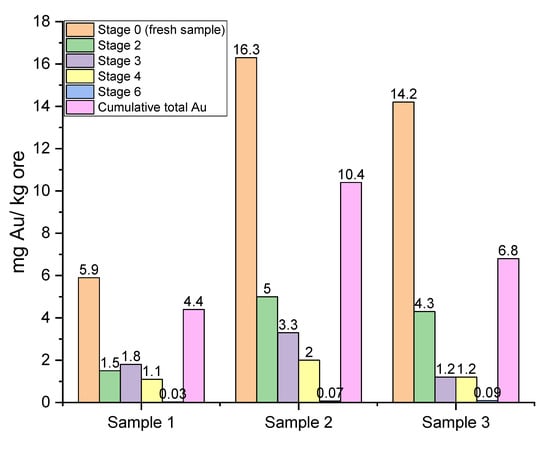 Figure 6 shows the cumulative total Au extracted in each of the stages for which Au concentration could be measured, for all three samples. The cumulative total Au extracted from the tailings obtained after panning (stage 1) were 4.4 mg Au/kg ore, 10.4 mg Au/kg ore, and 6.8 mg Au/kg ore for Sample 1, Sample 2, and Sample 3, respectively. These totals amount to 75%, 64%, and 48% of the Au originally present in Sample 1, Sample 2, and Sample 3, respectively. These percentages are a quantitative representation of the extent of refractoriness of these ores. The implication of this for ASM, where ores similar to the ones used in this study are found, is that miners would be losing 48%–75% of gold in their tailings by only relying on panning and Hg amalgamation of concentrates.