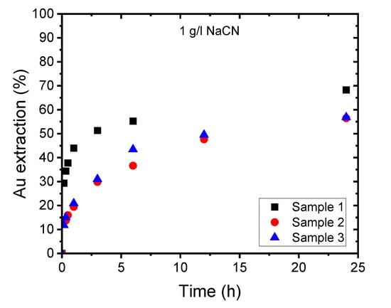 The plots in Figure 7, Figure 8 and Figure 9 show the Au extractions achieved by the three ore samples under study at 1 g/L, 3 g/L, and 5 g/L NaCN, respectively.
