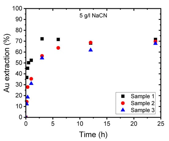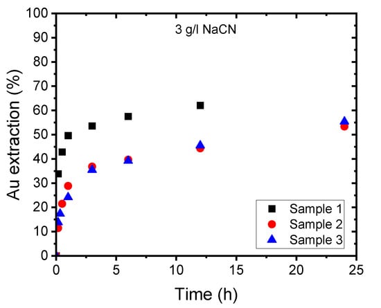 At 1 g/L NaCN, Sample 1 achieved the highest gold extraction at 68.2%, while Sample 2 and Sample 3 achieved 56.4% and 56.8%, respectively, after 24 h of leaching. At 3 g/L NaCN, Sample 1 still achieved the highest extraction at 62.0%, while Sample 2 and Sample 3 achieved 53.4% and 55.4%, respectively. Extractions at 3 g/L NaCN appear to be slightly lower than those achieved at 1 g/L NaCN. It should be noted that for Sample 1, at 3 g/L NaCN, gold extraction data were plotted only up to 12 h of leach time, as the leach sample at the 24 h mark was lost. At 5 g/L NaCN, Sample 1 reached an extraction of 71.6% while Sample 2 and Sample 3 achieved 69.7% and 67.8%, respectively. It can be observed, however, that there is a slight decrease in gold concentration for Sample 1 at 5 g/L NaCN after 3 h of leaching. Sample 2 and Sample 3 (the higher-grade ores) showed similar initials kinetics at the three cyanide concentrations.