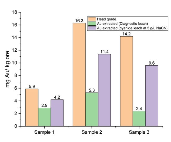 The presence, in the three ores, of sulphide minerals that host gold can be a major reason for the low gold extractions achieved, since any gold hosted by these minerals would be locked and difficult to recover by conventional cyanidation. This was in fact confirmed by the diagnostic leach results which showed that, by the action of acids, the gold locked in sulphides could be extracted. In addition, sulphides of copper and iron such as pyrite, arsenopyrite, and chalcopyrite, which have been shown to be present in these ores (Figure 4), can consume cyanide by forming cyanide complexes and converting free cyanide ions to cyanate and thiocyanate, leading to cyanide losses [38]. This cyanide consumption could be a reason, as well, for the leaching only improving at the higher cyanide concentration of 5 g/L as opposed to the experiment at 3 g/L NaCN, whereby Au extraction did not improve from the 1 g/L NaCN experiment. Passive aeration, which was used in the leach tests to mimic ASM conditions, could also have impacted the process negatively since not enough oxygen was present.