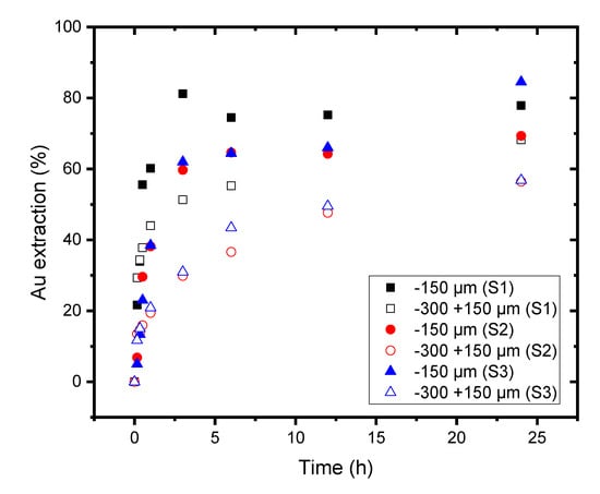 Leaching at a finer PSD significantly improved Au extractions and kinetics at −150 µm compared to −300 + 150 µm for the three ores (Figure 11). This is due to the higher liberation achieved by milling finer. However, this liberation is obtained from locked-in free gold, but not from the sulphides, as shown by the diagnostic leach results. As much as milling finer sounds like a simple fix to achieve higher gold extraction, it presents challenges when assessing it through the lens of ASGM. The sector relies significantly on rudimentary and low-efficiency gravity concentration methods, such as panning, to concentrate gold to either be directly sold, if the grade is high enough, or fed into a subsequent process such as amalgamation or leaching. Milling too fine makes gravity concentration much harder to achieve since gold is more easily lost with gangue minerals. This is something very difficult for miners to compromise on since, even in the case where no gold is wasted at all throughout the entire process, they will most likely only obtain 30%–50% of it by amalgamation [12]. However, if cyanide leaching becomes a substitute for all other recovery methods, working with smaller sizes would yield high Au recoveries.