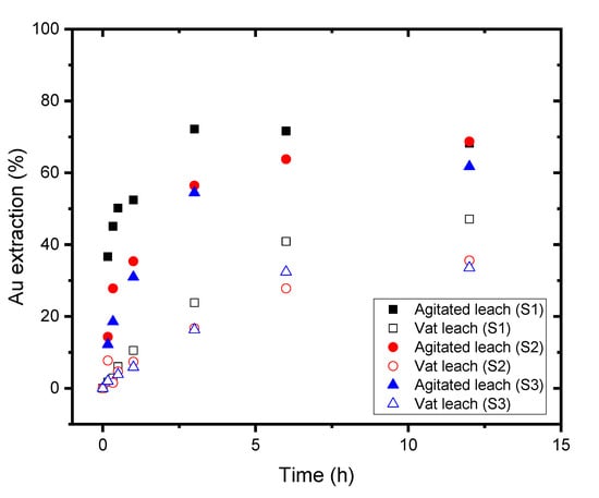 For all three ores under study, agitated leaching significantly outperformed vat leaching (Figure 12). Within the first hour of agitated leaching, the extractions achieved for the three ores were already higher than those achieved by vat leaching after 12 h, i.e., 68.2% for agitated leaching and 47.1% for vat leaching for Sample 1. Similarly, Samples 2 and 3 achieved 68.7% and 35.6%, and 61.7% and 33.6%, for agitated and vat leach, respectively. The higher extraction achieved with agitated leaching is likely due to better mixing of the solution and a reduction of the diffusion layer thickness between the lixiviant and the gold particles, as well as a higher degree of air ingress into the solution, which is severely limited in vat leaching. Given that vat leaching is widely applied in ASGM, there is potential for miners to make better returns by introducing a degree of agitation during leaching or at least some form of solution circulation to ensure re-aeration of the solution.