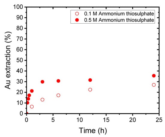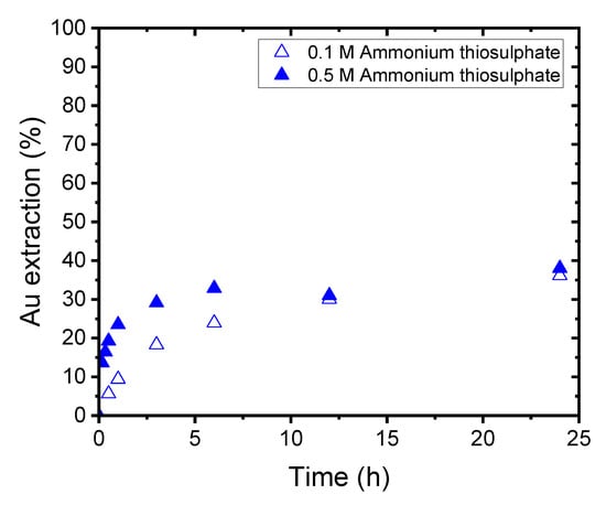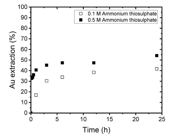 Figure 13, Figure 14 and Figure 15 show the effect of varying thiosulphate concentrations on the three ore samples while maintaining the NH3 and Cu concentration at 0.5 M and 1 mM, respectively. The general observation is that Au extractions are low in the thiosulphate system. However, across the three ores, increasing the thiosulphate concentration from 0.1 M to 0.5 M resulted in an increase in gold extraction. For Sample 1, final extraction increased from 41.7% to 54.1%; for Sample 2, extraction increased from 27.0% to 35.6% after 24 h of leaching, while Sample 3 experienced a more modest increase from 36.1% to 38.0%.