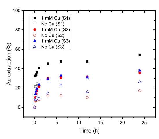 Figure 16 shows the impact of the presence of Cu(II) on gold extraction at 0.5 M (NH4)2S2O3 and 0.5 M NH3 for Sample 1, Sample 2, and Sample 3, respectively. Across the three ores, the presence of Cu(II) had a positive impact on extraction when compared to a system with no Cu(II) present. For Sample 1, the final extraction without Cu(II) was 38.4%, while the presence of 1 mM Cu(II) resulted in a higher extraction of 54.1%. For Sample 2, gold extraction increased from 17.2% to 35.6% after adding Cu(II), and for Sample 3, gold extraction increased from 26.3% to 38.0% after 24 h of leaching.