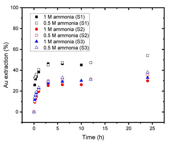 Figure 17 shows the effect of increasing the concentration of NH3 from 0.5 M to 1 M on gold extraction for each ore. Overall, increasing the concentration did not have a significant impact on the leaching process. For Sample 1, the extraction trends did not change, with the final extraction at both concentrations of NH3 reaching 54.1% after 24 h (both final extraction data points coincide in Figure 17). For Sample 2, increasing the concentration of NH3 resulted in a decrease in gold extraction, from 35.6% at 0.5 M NH3 to 29.9% at 1 M NH3. In a similar way, the gold extraction for Sample 3 dropped from 38.0% at 0.5 M NH3 to 32.9% at 1 M NH3.
