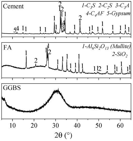 Ordinary Portland cement (OPC), FA, GGBS, crushed limestone, and river sand were used in this study. The OPC (Type I 42.5) conformed to the Chinese National Standard GB 175–2007 (Common Portland Cement). The low-calcium FA conformed to the requirements of Chinese National Standard GB/T 1596–2005 (fly ash used for cement and concrete). GGBS met the requirements of Chinese National Standard GB/T 18046-2000 (ground granulated blast furnace slag used for cement and concrete). The specific surface areas (Blaine method) of OPC, FA, and GGBS were 380 m2/kg, 355 m2/kg, and 415 m2/kg, respectively. The chemical (SHIMADZU Corporation, Japan, XRF-1800) and mineralogical (XRD, Bruker D8, Germany, CuKα, 45 kV, 40 mA) compositions of the materials are shown in Table 1 and Figure 1, respectively. The river sand complied with the Chinese Standard GB/T14684 (sand for construction). Its fineness modulus was 2.66, and its bulk density was 1470 kg/m3. The crushed limestone conformed to the Chinese Standard GB/T14685 (pebble and crushed stone for building), and it had a continuous gradation from 5 mm to 25 mm. In addition, the commercial polycarboxylic superplasticizer was used to adjust the concrete workability.