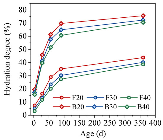 where is the surface tension; is the Kelvin radius; and is the contact angle. From Equation (5), it can be found that finer pore radius results in greater capillary pressure. Incorporation of a large proportion of FA and GGBS is known to reduce the drying shrinkage [15,34,35]. It is because replacing cement with FA or GGBS increases the pore diameter, as revealed by many researchers. Based on the results from the mercury intrusion porosimetry (MIP), Wang et al. found that the microstructure of cement-FA composite paste (50% replacement level) was coarser than the plain cement paste at 90 days, with the most probable aperture increasing from approximately 40 µm to 70 µm [36]; Park et al. [37] found that replacing cement with 50% FA increased the volume fractions of large pores (50–100 nm and above 100 nm) at 28 and 90 days. Using 2D and 3D imagining, Yio et al. [38] also found that FA replacement (23 wt.%) increased the large pore volume at 90 days. Compared with FA, GGBS is well-known to be more reactive, whose reaction degree can achieve approximately 50%–65% at 90 days, much higher than the approximately 15%–30% of FA [13]. Therefore, low GGBS content tends to refine the microstructure of hardened pastes, but high-volume GGBS can also increase the pore diameter. It was found that a 60% GGBS replacement level increased the volume of large pores at a water-to-binder ratio of 0.45 [38]. Alderete et al. [39] also found that 40% and 60% GGBS incorporation increased the pore volume of mesopores at 28 days from the dynamic water vapor sorption (DVS) data. The discussion on the pore structure is consistent with the shrinkage results in Figure 7 that sample B20, with refined pore structure, shows a higher drying shrinkage value than sample C, while F30, F40, and B40 show lower shrinkage values.