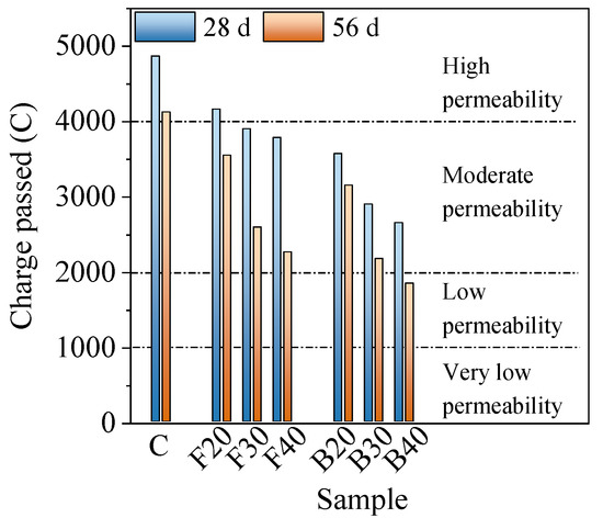 Figure 5 presents the charge passed and permeability grade of the concrete under the condition of an equal 28-day strength grade. The charge passed of concrete at 56 days is lower than that at 28 days due to the increased hydration degrees and the denser microstructure [11]. Replacing OPC with FA and GGBS reduces the charge passed of concrete, especially at the later age of 56 days. Incorporating 20% FA can decrease the concrete permeability grade from high permeability (above 4000 C) to moderate permeability (2000–4000 C) at 56 days, but cannot cause this decrease at 28 days. At higher replacement levels with FA (30% and 40%), concrete can obtain a moderate permeability grade at both 28 days and 56 days. It indicates that FA can improve the resistance to chloride ion penetration of the concrete, especially at high replacement levels, which is consistent with the references [8,21]. This improvement can be attributed to the pozzolanic reaction of FA, which can consume Ca(OH)2 to form C-S-H gel, improve the interfacial transition zone of concrete, and decrease the connectivity of the pores [29]. Compared with FA, GGBS presents a greater improvement in the concrete permeability. A 40% GGBS incorporation can decrease the high permeability grade to low at 56 days. It is because GGBS shows high hydraulicity and hydrates to form additional C-S-H gels, which can better improve the interfacial transition zone of concrete and decrease the connectivity [29]. In addition, the GGBS-cement concrete may also show better chloride ion-binding capacity than FA-cement concrete [30].