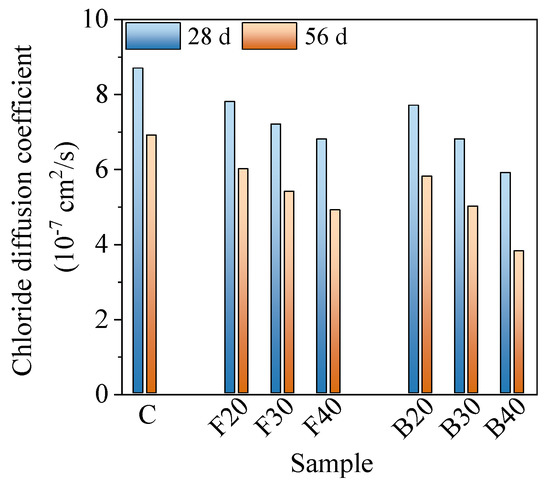 Apart from the charge passed, the chloride diffusion coefficient can also characterize the resistance to chloride ion penetration of concrete [6]. Therefore, the chloride diffusion coefficients of concrete with an equal 28-day strength grade are used to further support the roles of FA and GGBS, as shown in Figure 6. The results show similar trends with the charge passed of concrete, which means that the two methods have good consistency and can effectively characterize the resistance to chloride ion penetration of concrete. Based on the results in Figure 3 and Figure 4, it can be concluded that FA and GGBS have positive effects on the resistance to chloride ion penetration of the concrete, especially at a high replacement level (40%), and the ability of GGBS to resist the chloride ion penetration is stronger than that of FA under an equal strength grade.