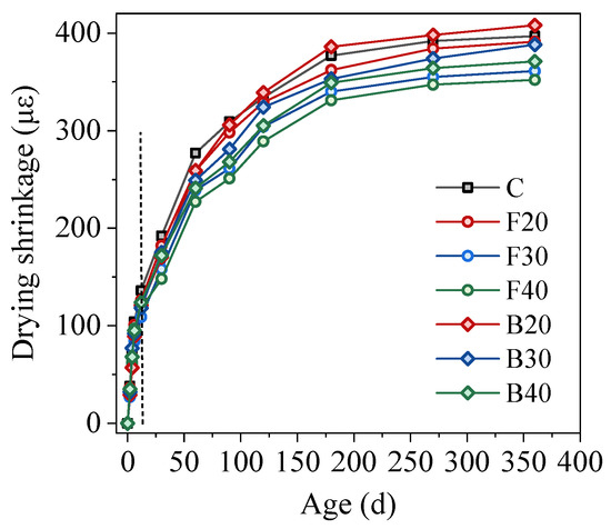 Figure 7 shows the drying shrinkage of the concrete with an equal strength grade within 1 year. It can be observed that the shrinkages increase rapidly during the initial 12 days. This is due to the rapid loss of moisture from hardened concrete to the environment, which causes a volume reduction of the concrete by the negative capillary pressure [31]. The shrinkage curves slow down after 12 days and become flat after 180 days. It is because with hydration, the denser microstructures make the moisture harder to transfer. The plain cement concrete shows high dry shrinkage values at both the initial and late ages. The high values at the initial stage could be attributed to the high w/b ratio, which makes the water easier to evaporate. At late ages, the high shrinkage is most likely due to the refined pores, which can produce higher capillary pressure when losing the same amount of water. The substitution of cement by FA and GGBS, especially at high replacement levels, slightly decreases the drying shrinkage at the initial stage due to the reduced w/b ratio. At late ages, high replacement levels (30% and 40% for FA, and 40% for GGBS) can significantly decrease the drying shrinkage. Generally, the concrete shrinkage arises from the capillary pressure generated by the surface tension of the pore solution [32]. This pressure can be theoretically calculated according to the Young-Laplace Equation [33]: