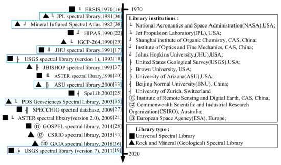 Multi- and hyper-spectral mineralogical data obtained by field-based, airborne, or spaceborne measurements are mainly stored in various spectral databases [,,]. Figure 1 shows a brief record of representative mineralogical spectral libraries around the world. Since the 1970s, many research teams have set up separate spectral databases for various fields. Since 2010, the United States Geological Survey (USGS) and Advanced Spaceborne Thermal Emission Reflection Radiometer (ASTER) spectral libraries (as the most representative ground-object libraries worldwide) have been cited more than 200 times per year on average, indicating the broad recognition of spectral libraries in scientific research []. However, the availability of the existing shared libraries is limited by particular sample representativeness, semantic differences, test conditions, and sharing formats, making the wide sharing and use of rocks/minerals spectral data difficult or inconvenient [,].