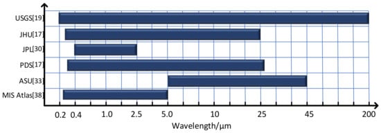 The International Geologic Correlation Program (Project IGCP-264), consisting of reflectance spectra measured by 5 spectrometers for 26 common minerals with different spectral resolutions, can be applied for the automated identification of geologic materials on the basis of their spectral characteristics in the imaging spectrometer data from the Airborne Visible/Infrared Imaging Spectrometer (AVIRIS) []. JPL took the lead in developing a standard mineral spectral database in which 135 minerals were selected according to three particle size scales to study the influence of mineral particle size on reflectivity [,]. The mineral infrared atlas that covers wavelengths from visible-near infrared to mid-infrared (0.3–4 μm) [], Arizona State University (ASU) thermal infrared spectral library that covers wavelengths from mid-infrared to far infrared (5–45 μm) [], and Commonwealth Scientific and Industrial Research Organization spectral library [] that covers wavelengths from mid-infrared to far infrared (2–25 μm) were established for rock/mineral infrared information and mineral resources exploration. The spectral libraries of planetary geology (e.g., PDS [] and Gaia spectral library []), containing the spectral data of Earth and other planetary materials, are widely used in planetary geology and astronomy.