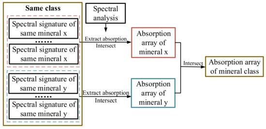 A custom spectral classifier (Figure 5) was developed based on the data features to limit the matching range when unknown spectra without any parameters are matched with the reference spectra. The absorption position of the spectrum reflects the mineral composition that can be used to distinguish mineral categories and establish the tree of classification characteristics []. The customised classifier method resamples spectral data, calculates the absorption position of each curve, and then intersects with the eigen values of the multiple curves of the same mineral to determine the common characteristics []. Subsequently, the absorption positions of different minerals from the same mineral subclass or class were intersected to determine new subclasses and classes. Based on the custom classifier, a multifurcating tree containing the absorption positions of each mineral, subclass, and class was established in the RockSL.