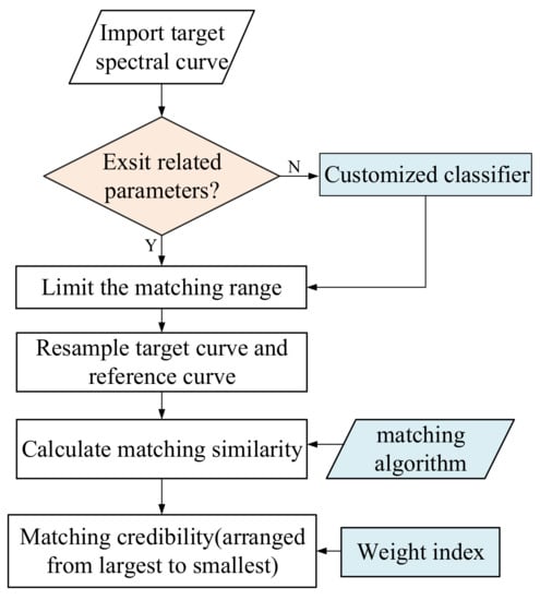 The BCM assigns the points on the spectral curve to 0 or 1.0 in advance through the spectral reflectance/emissivity threshold (the average value of the entire spectrum), greatly improving the efficiency of matching recognition. After converting the reference and target spectra into binary arrays, the matching similarity of the two arrays is calculated []. The SAM regards the spectral curve as a vector in multidimensional space and uses the angle between the target and reference spectra to represent their matching similarity [], relying on the shape of the entire spectral curve and ignoring the differences between local features. The calculation is shown in Formula (5). The SID mapping method aims to calculate the SID from the perspective of information theory []. SID_SA combines SID and spectral angle matching (SA). The correlation coefficient of two spectral curves can also be calculated by SCF [] as shown in Formula (4). We also propose a custom matching method, which unifies the similarity measures of the above methods and takes their average value to evaluate the matching effect. The matching mechanism of the operating system is shown in Figure 6. To improve the matching efficiency, the existing information of the unknown spectrum is used to limit the matching range. The target spectrum without corresponding information is pre-classified by the customised classifier described above. Given that the RockSL retains the original information of the shared data (i.e., the spectral resolution), the system automatically resamples the spectrum according to the target spectrum information. We also consider the proportion of the matching wavelength range to the entire range of the target spectrum as the weighted index, which is multiplied by the matching similarity to obtain the index of the matching credibility. Finally, the reference spectra to be matched (with the matching credibility arranged from largest to smallest) and the related metadata are displayed.