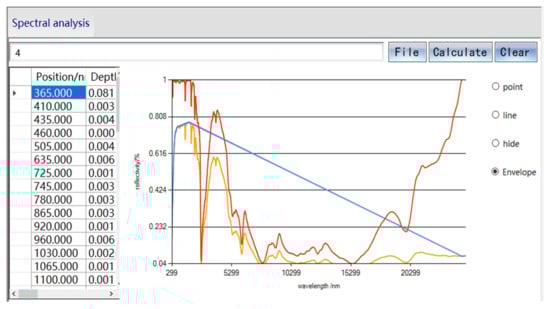 As mentioned above, the absorption position and waveform information (e.g., absorption depth and width) of spectral data are the determination indices of the mineral composition category and content. Hence, a spectral analysis module was design to perform pre-processing (i.e., spectral derivative and continuous spectrum removal), highlighting the characteristics of spectral curves. The implementation of the convex hull algorithm [] is shown in Figure 7. However, the absorption features in a wide concave region are difficult to distinguish, which will be addressed and embedded into the system for release. In addition, the spectral analysis module calculates several absorption waveform parameters of the spectral curve (e.g., absorption position, absorption width, absorption height, absorption area, absorption peak number, absorption symmetry, spectral slope, and spectral absorption index), providing certain support for the subsequent establishment of a spectral knowledge base [].