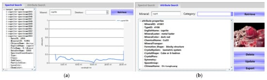 Mineral retrieve of the operating system (search example: cuprite). (a) The retrieval interface of the spectral information; (b) the retrieval interface of the mineral attribute shows the attribute information and mineral image (cuprite, downloaded from an open website).