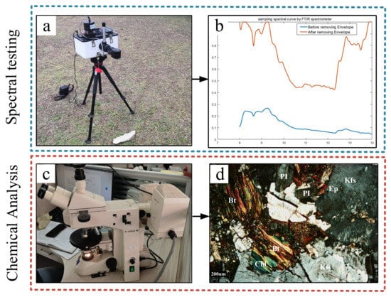 Rocks are special materials formed in the Earth’s crust and composed of one or multiple minerals. Rocks play a key role in the resource production of human society. The analysis of rocks and minerals involves determination of the chemical composition of the target minerals to provide accurate prior information for ore exploitation and mineral deposit discovery. In the 1950s, the wet chemical method was used to analyse the mineral composition, which can carry out detailed analysis and ingredients records. However, this method has a relatively long process, involves great costs to obtain results, and is likely to cause serious environmental pollution. After the 1950s, the original method of chemical analysis began to be replaced by instrumental analysis (e.g., the thin section identification method, X-ray diffraction, and electron microprobe analysis) due to the emergence of many advanced and accurate instruments. Some instrumental analysis methods are expensive and time-consuming, but visible and infrared spectroscopy is a relatively fast, economical, and real-time technique for characterising minerals and rocks by remote sensing and proximal sensing [,].