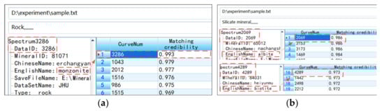 Identification of unknown rock and its composition by the RockSL. (a) The spectral curve of the monzonite (No. 3286) matched well with the spectra of the specimen. (b) Mineral curves of albite (No. 2069) and biotite (No. 4289) matched well with the spectra of the specimen.