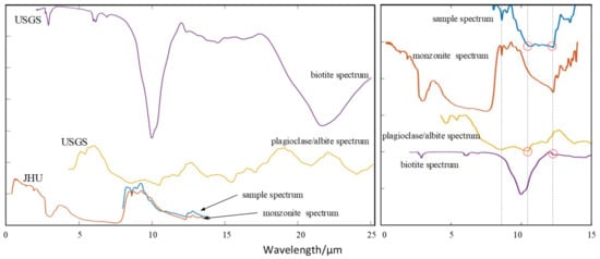 As shown in Figure 10a, we first used the SID_SA algorithm to match the spectral data of rock categories in the RockSL and finally found the monzonite spectrum with a matching credibility of approximately 0.993. The matching credibility of the reference spectrum of monzonite and the unknown spectrum calculated by various methods obtained the highest value. We inferred that the rock sample is monzonite, which could be composed of silicate minerals, including plagioclase, alkaline feldspar, pyroxene, amphibole, mica, and other minerals. The reference spectrum of monzonite in the RockSL was collected from the JHU library, including the petrographic description and chemical analysis of the specific mineral compositions (i.e., 70% feldspar, 18% quartz, 8.2% pyroxene, 2% opaques, and 1.2% biotite). Then, the matching module was set in the range of silicate minerals for the matching analysis of its mineral composition. Furthermore, the mineral curves of albite and biotite collected from the USGS library also obtained high matching credibility scores of 0.986 and 0.973, respectively, through the SID_SA algorithm (Figure 10b). These spectral curves are consistent with the features of the target spectrum in different intervals and consistent with the mineral compositions of the monzonite spectrum. To make the result of the curve matching obvious, multiple mineral spectral curves are visualised together for detailed comparison and cognition (Figure 11).