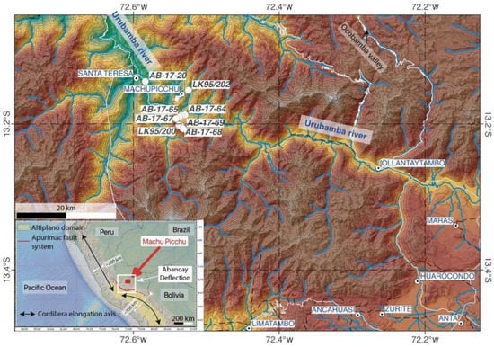 - Gérard, B.; Audin, L.; Robert, X.; Gautheron, C.; van der Beek, P.; Bernet, M.; Benavente, C.; Delgado, F. Pliocene River Capture and Incision of the Northern Altiplano: Machu Picchu, Peru. J. Geol. Soc. 2021, 178, jgs2020–jgs2100. [Google Scholar] [CrossRef]