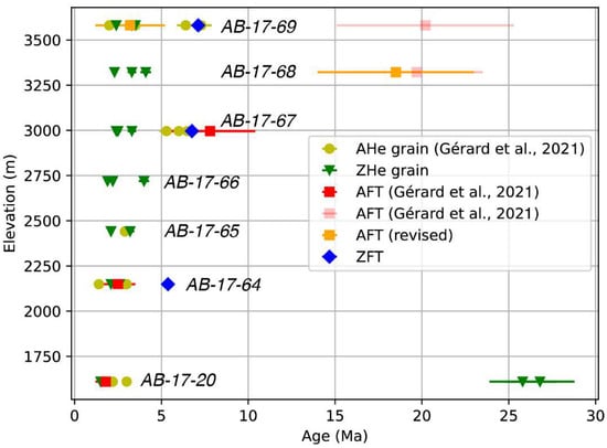 These new ZHe and ZFT data are much younger and thus apparently incompatible with the two highest AFT ages (AB-17-68 and AB-17-69 from [20]) in the profile. We thus revised the counting of these two AFT samples (Figure 2; Supplementary Materials Figures S1 and S2). In fact, both of the highest AFT samples are difficult to date because of poor apatite quality (fractures, inclusions), as mentioned in [20]; thus, these two samples yield unreliable AFT ages. After revision, the highest sample (AB-17-69) gives an AFT age more compatible with the zircon data (3.1 Ma) but still not reliable because of the few grains (10) dated and because of the low apatite quality and U zonation. The second highest sample (AB-17-68) with a central age of 18.5 Ma remains older than the other samples in the profile. Here, also, the very low counts question the validity of this age (Table 3). For these reasons, we will not base the following discussion on the highest fission track data in the profile.