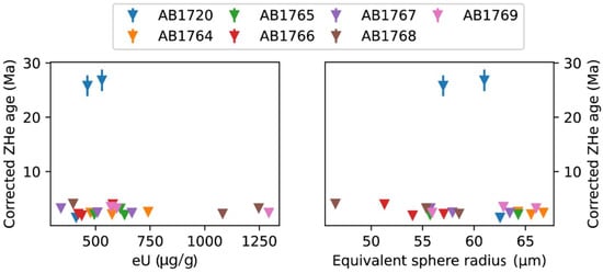 ZHe grain age of all the samples from the Machu Picchu vertical profile as a function of the equivalent uranium concentration (eU; left panel) and the equivalent sphere radius (ESR, right panel). Error bars are mostly smaller than the size of the points. There are no clear trends.