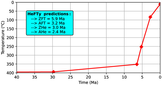 Time-temperature path used in HeFTy [44] to predict AHe, ZHe, AFT, and ZFT ages (in the blue box) using the model and model parameters of RDAMM [13], ZRDAAM [15,51] and the parallel curvilinear model of [51], respectively. This time–temperature path is an adaptation for higher closure temperature systems of the time temperature paths proposed for the southern Abancay Deflection by [27].