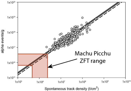 Plot of the Machu Picchu ZFT data (light red area) in the simplified spontaneous track density (s) and α-dose relationship from [45]. Grey dots are the 336 zircons they analyzed, and the dashed and full lines represent the approximate and full relationships they computed, respectively. Spontaneous track densities from the Machu Picchu zircons indicate α-doses below 4 × 1016 α/g.