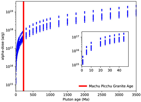 α-dose as a function of the age of a pluton computed for the samples of the Machu Picchu vertical profile (blue dots). The thick red vertical line corresponds to the ages of the Machu Picchu batholith, ~222 Ma, [23]. Light red horizontal bands show the α-dose values that are compatible with the ZHe data from Machu Picchu. We estimated them with the relationship between the ZHe closure temperature, the α-dose, and the estimated ZHe closure temperature from the Machu Picchu. The inset is an enlargement of the first part of the graph.
